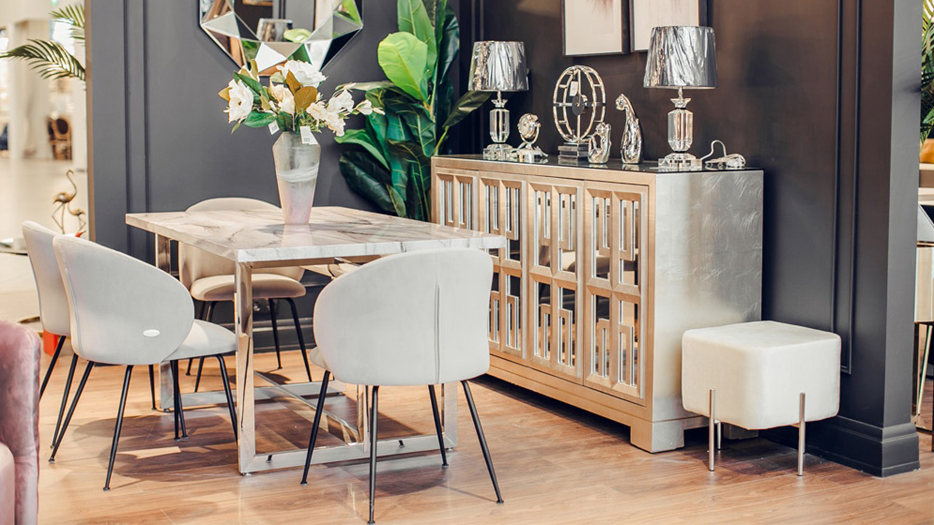 Не забывайте про игру фактур и комбинируйте металл и мрамор с мягким велюром в обивке стульев.