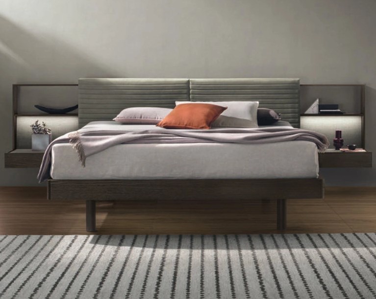 Деревянное основание на высоких круглых ножках дополнено мягким изголовьем в отделке тканью. Комод с ассиметричными ручками и декоративным покрытием Лен.
