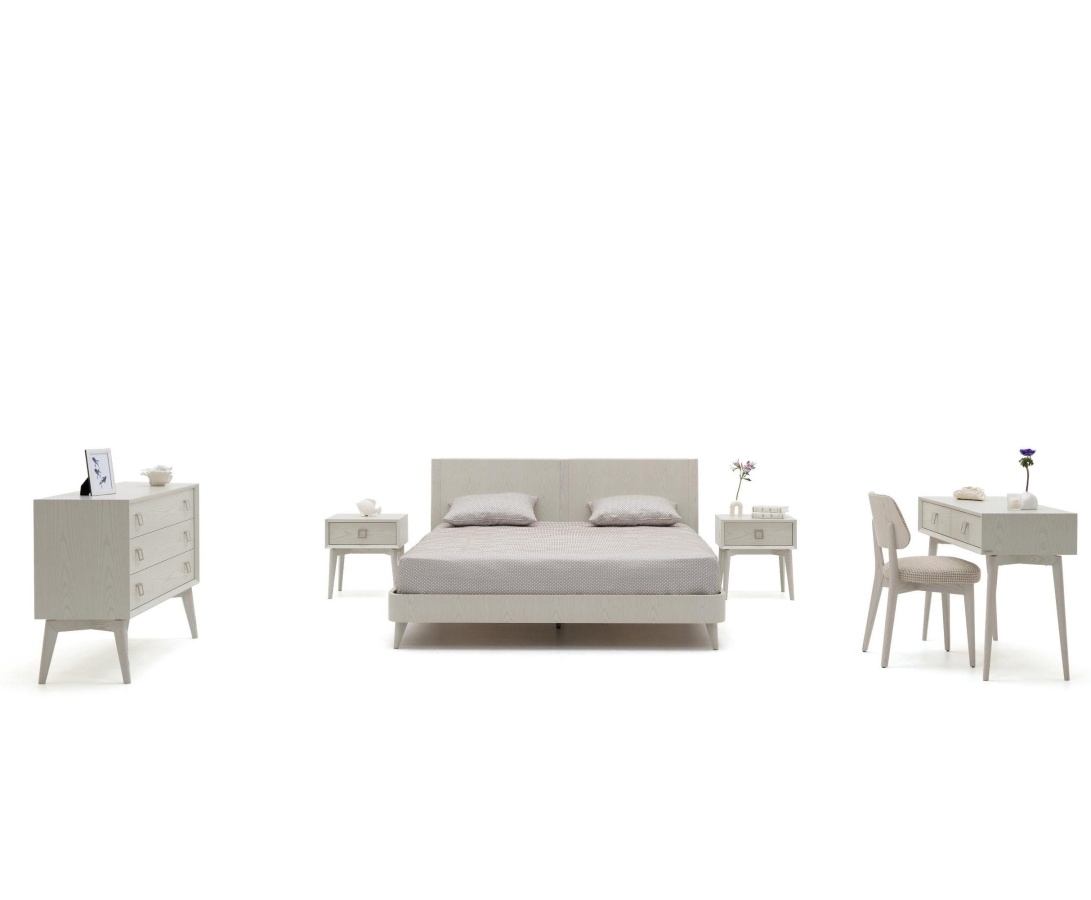 Ей в дополнение служат вместительные тумбы, комод и туалетный столик с четким рамочным фасадом.