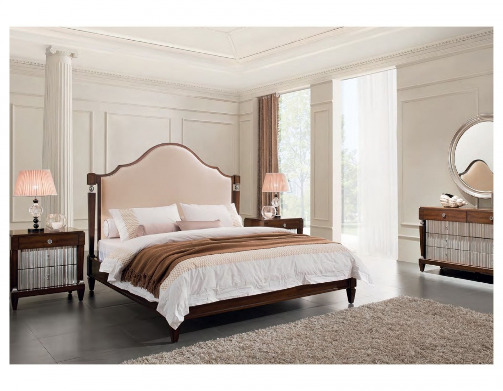 Кровать с решеткой отделка шпон вишни C, ткань светло-бежевый велюр фабрики Fratelli Barri