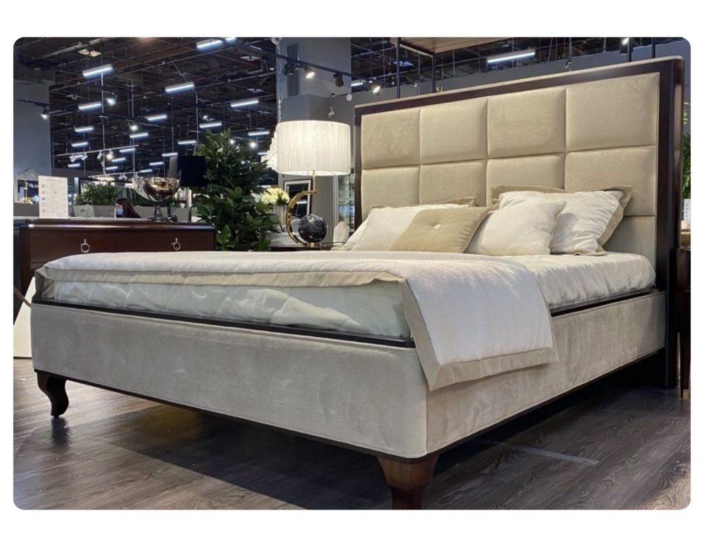 Изголовье с загнутыми боковинками, обитое серым велюром и декорировано стежкой капитоне с пуговицами. База, ножки и боковые части изголовья в отделке шпон вишни. Сделана из массива дерева и высококачественного МДФ высокой плотности. Комплектуется решеткой производства России.