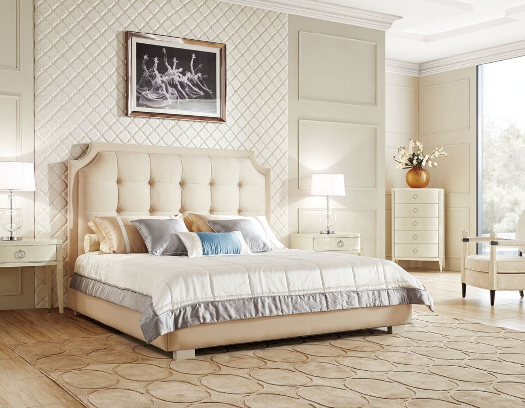 Кровать с фигурным изголовьем выполнена в стиле неоклассика. Изголовье декорировано капитоне. Размер спального места 180*200 см.