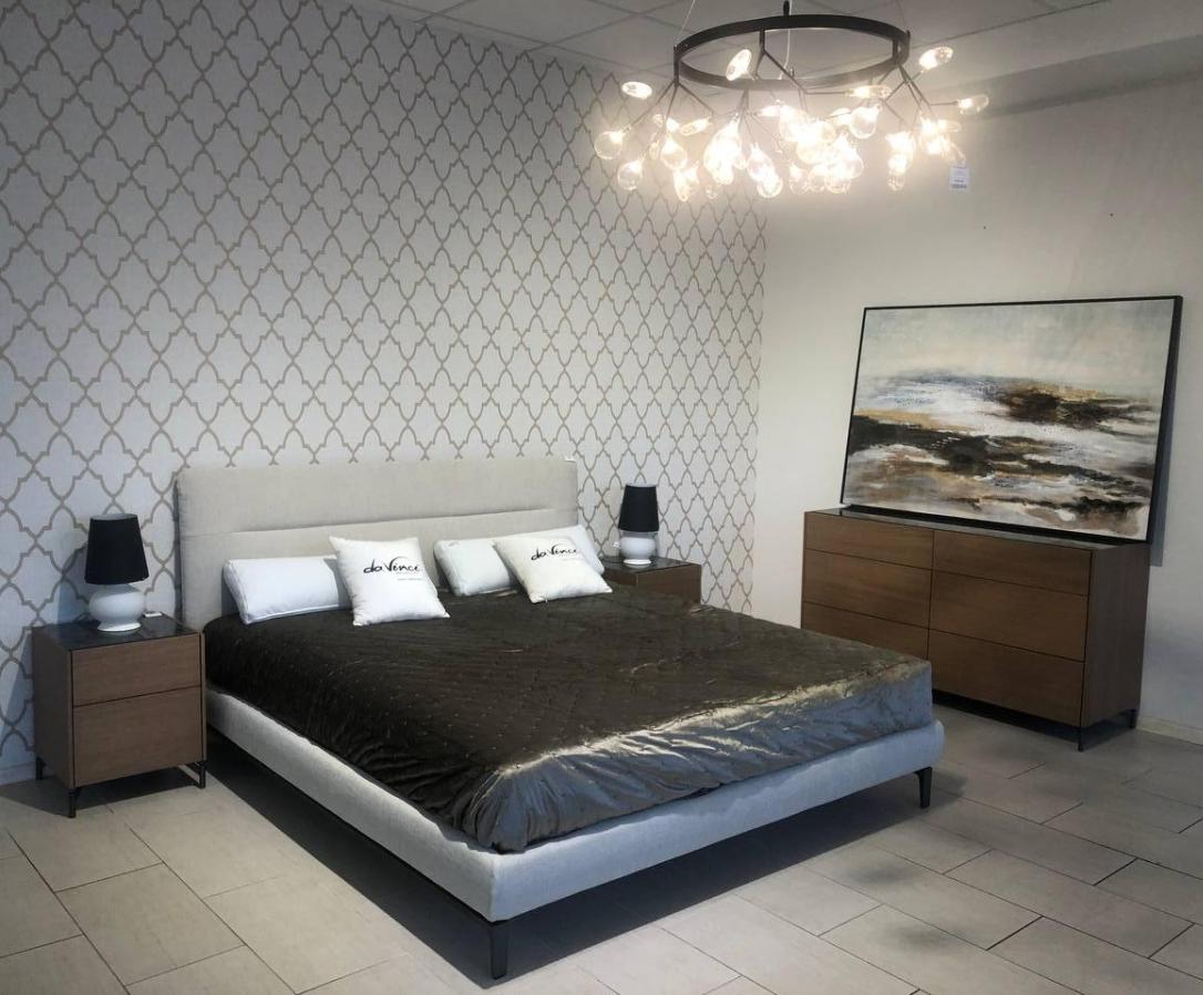 Простая горизонтальная строчка в центре изголовья определяет стиль этой дизайнерской кровати с мягкой обивкой.