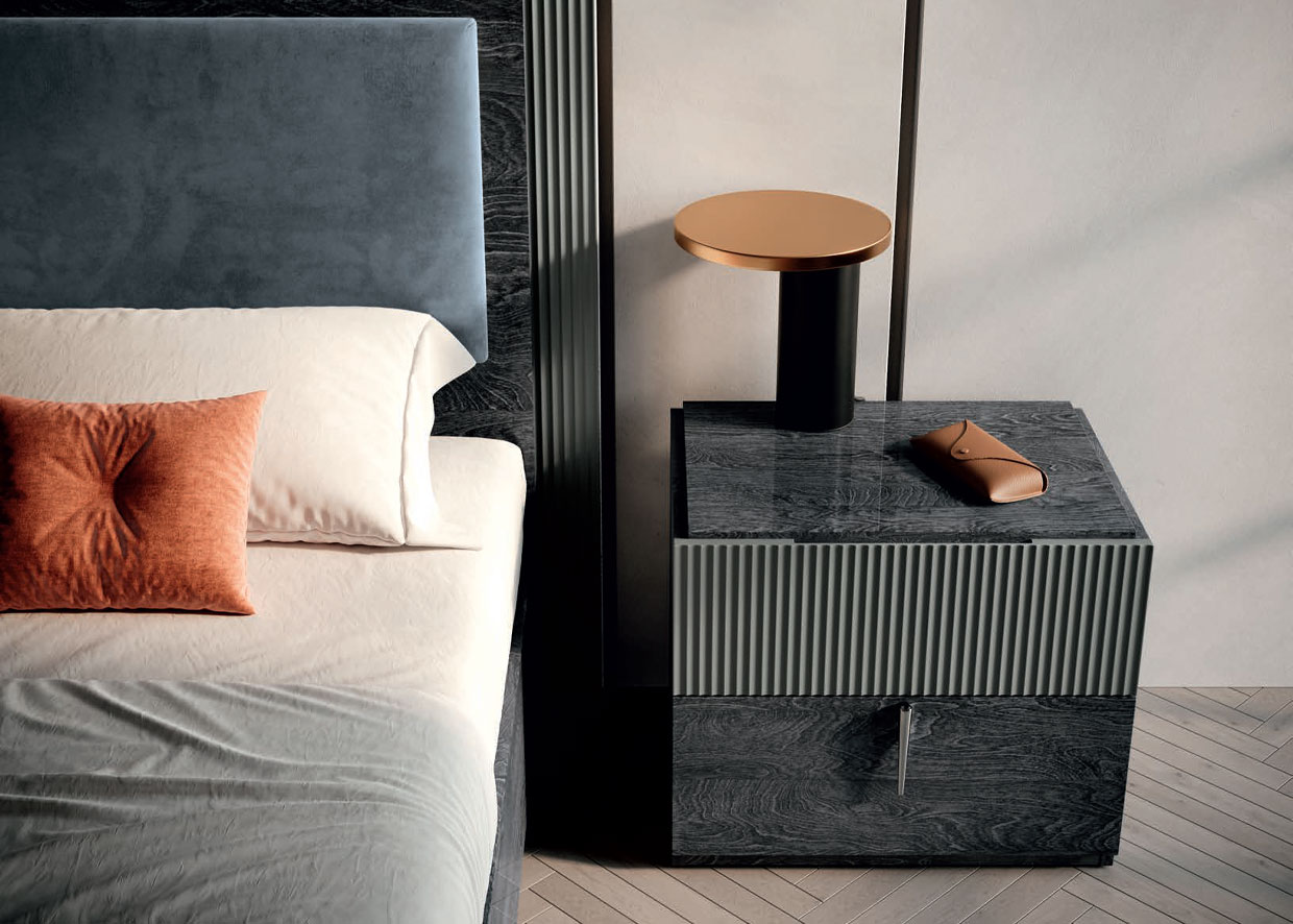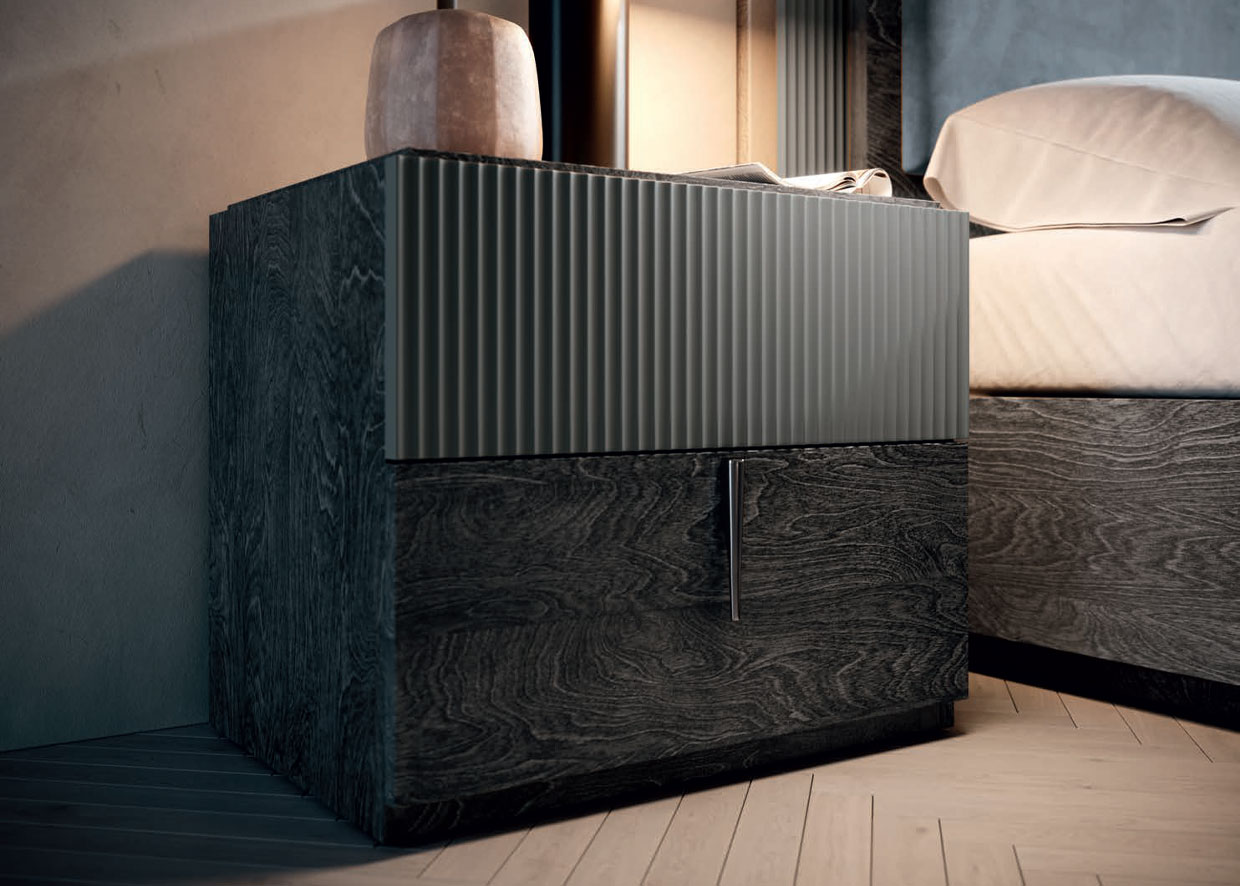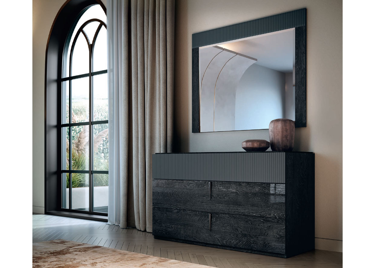 Отличается современным сочетанием рифленых ящиков в матовой металлической отделкой и глянцевыми верхними и боковыми панелями темно-синего цвета.