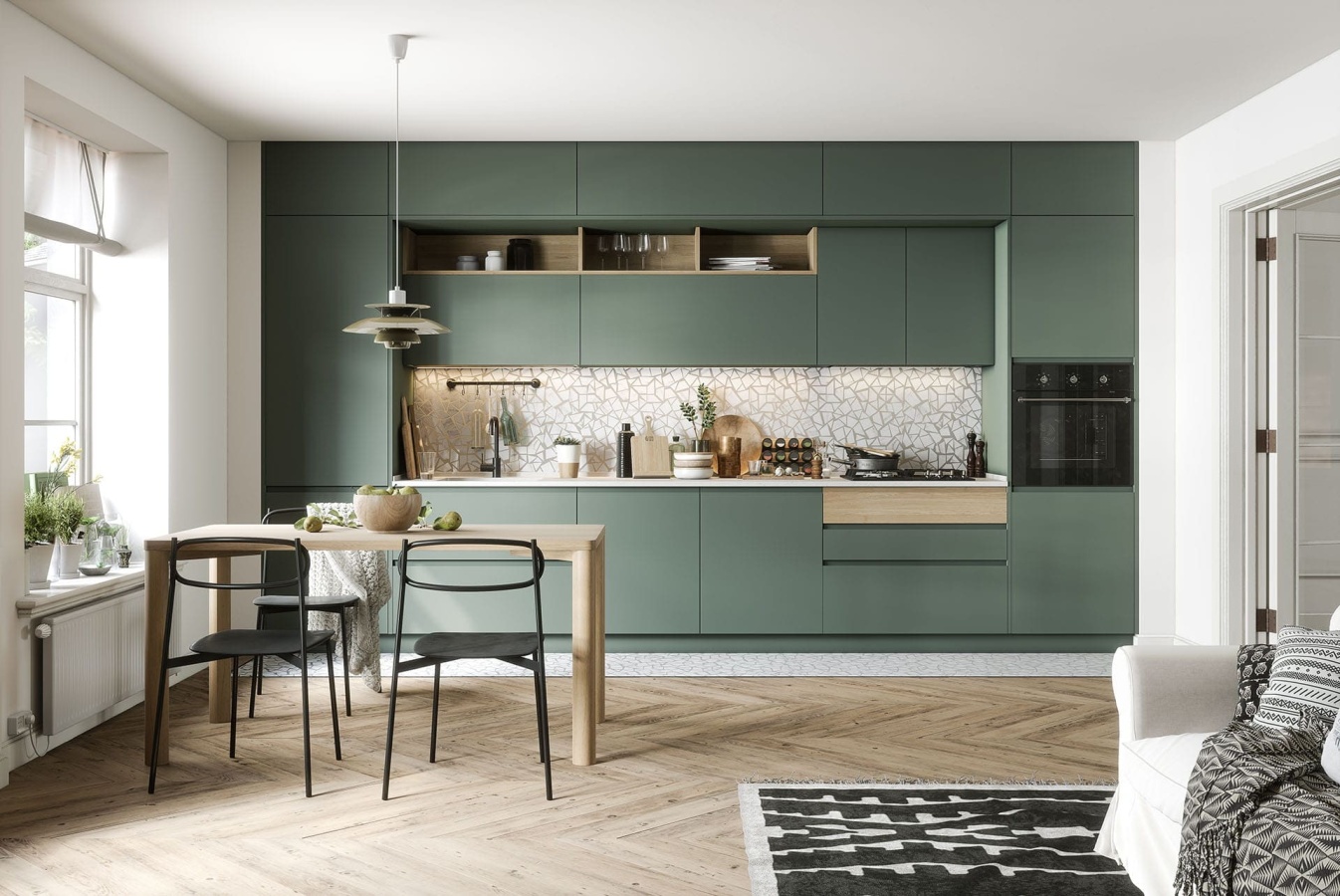 Особенностью Капри являются элементы фасада, изготовленные из ДСП, шпонированной древесиной дуба или ясеня, а также из крашеной МДФ. При этом роль ручки может выполнять специальный J-профиль, интегрированный в плоскость двери или накладки ящика. Возможно также использование традиционных накладных ручек. Застеклённые двери кухни Капри - это высокотехнологичная конструкция на основе изящного алюминиевого профиля, шпонированной или крашеной плиты МДФ.