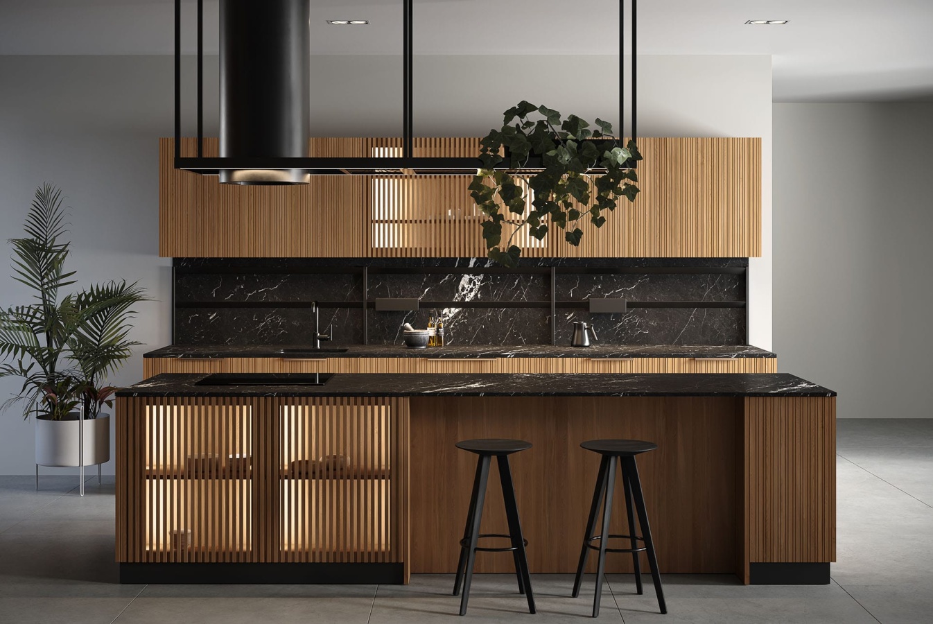 Современная кухня, выполненная в духе минимализма. Фасад Котры, в соответствии с самыми популярными тенденциями европейского дизайна, имеет рельефную структуру поверхности. Вертикальная фрезеровка шпонированных или наборанных из деревянных планок фасадов формирует неповторимый динамичный облик этой кухни.