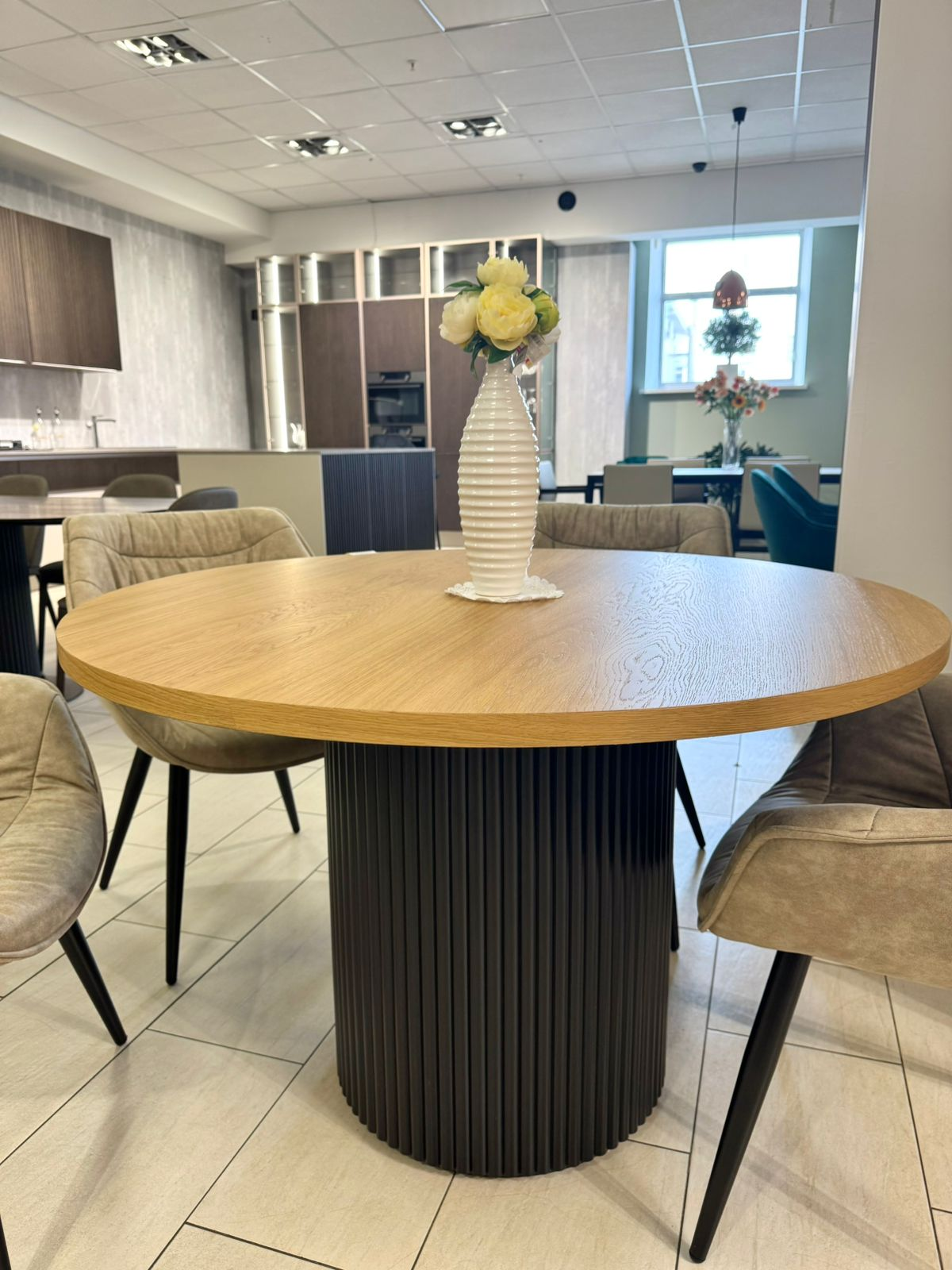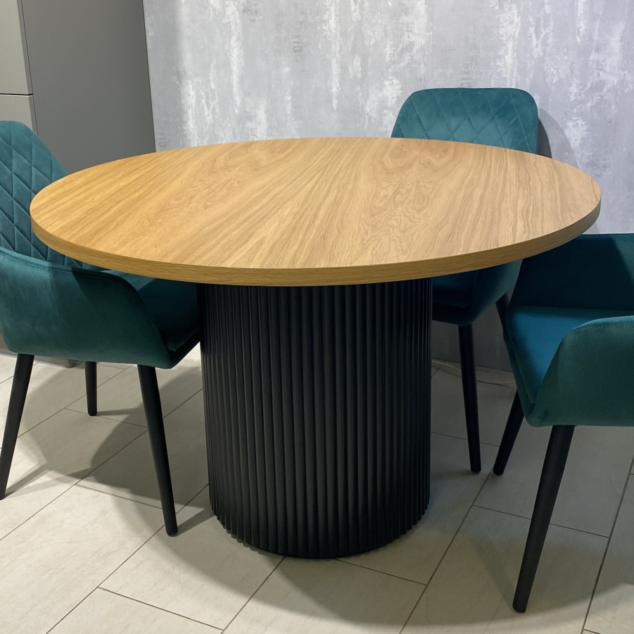 В наличии стол со столешницей МДФ шпон, возможно на заказ исполнение в керамике, стекле, HPL пластике, а также покраска шпона и опоры.