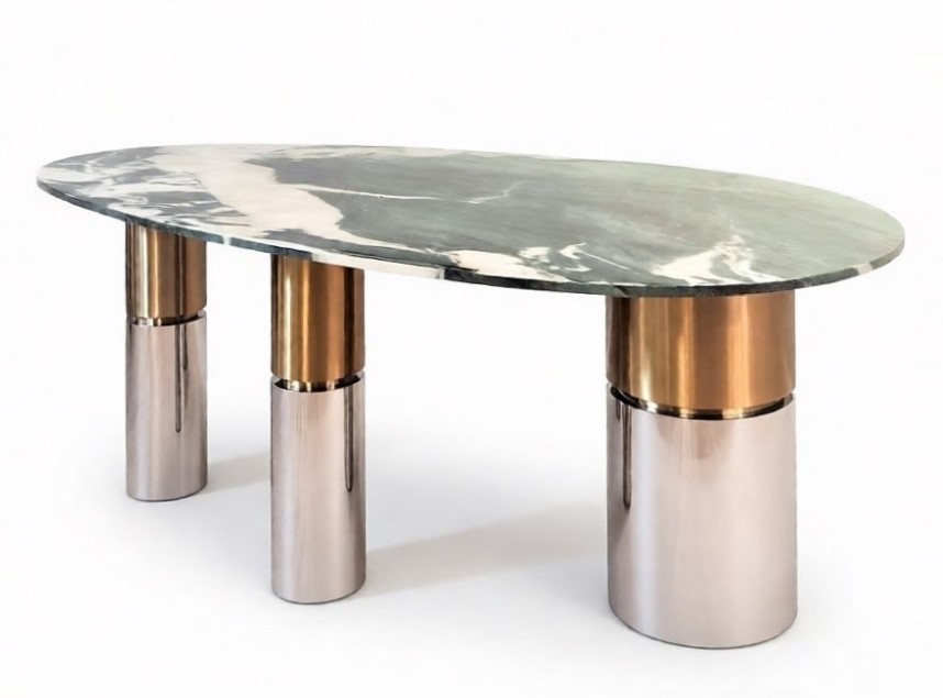 В геометрии трех вертикальных опор гармонично сочетаются матовое золото и блеск хромированного металла.