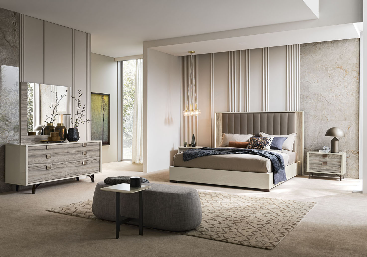 Правильный выбор мебели и освещения формирует основу роскошного интерьера спальни Jupiter. Центральное место в коллекции занимает кровать с высоким мягким изголовьем и элегантными золотыми вставками, которые гармонично сочетаются с общей цветовой гаммой помещения. Дополняет композицию банкетка, изготовленная из тех же высококачественных материалов, что создает ощущение единства и целостности пространства.